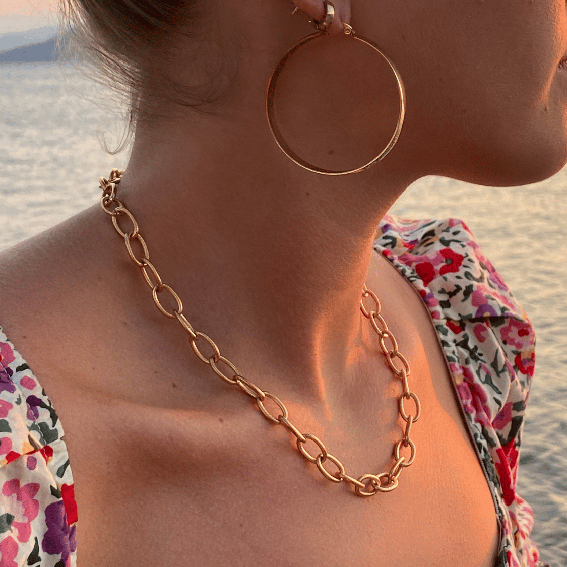 Guldbelagt kirurgisk stål, nikkelfri og vandfaste. Smykket tåler vand, sved, parfume og mister ikke farven