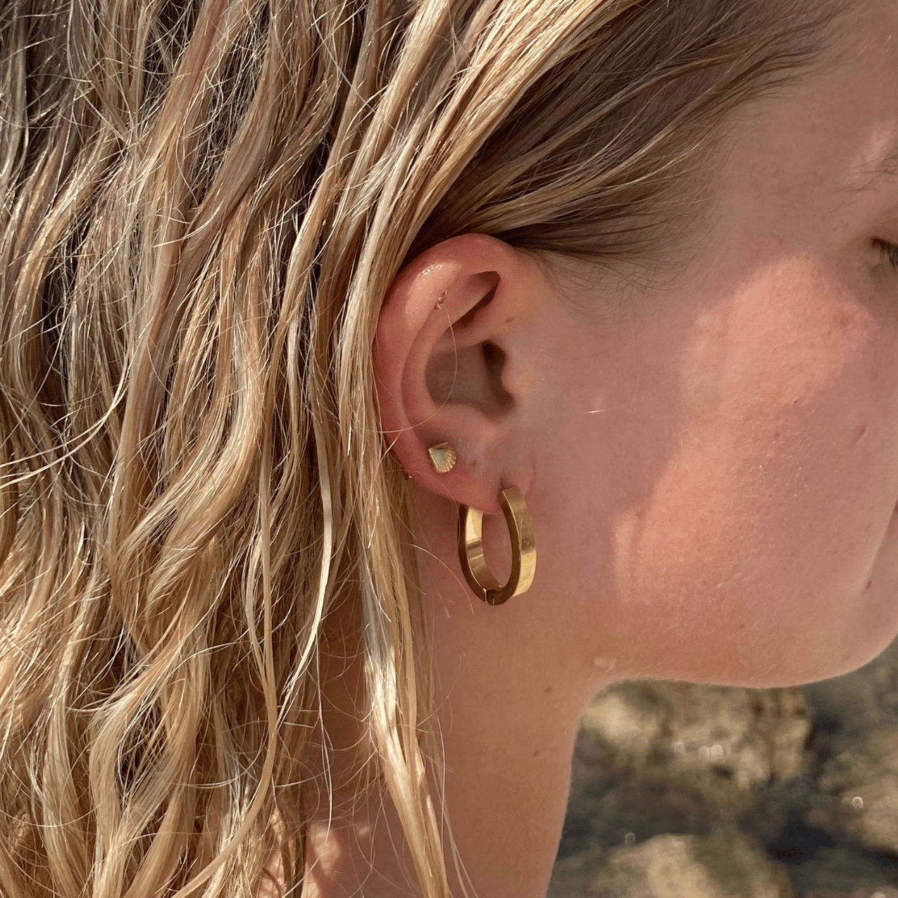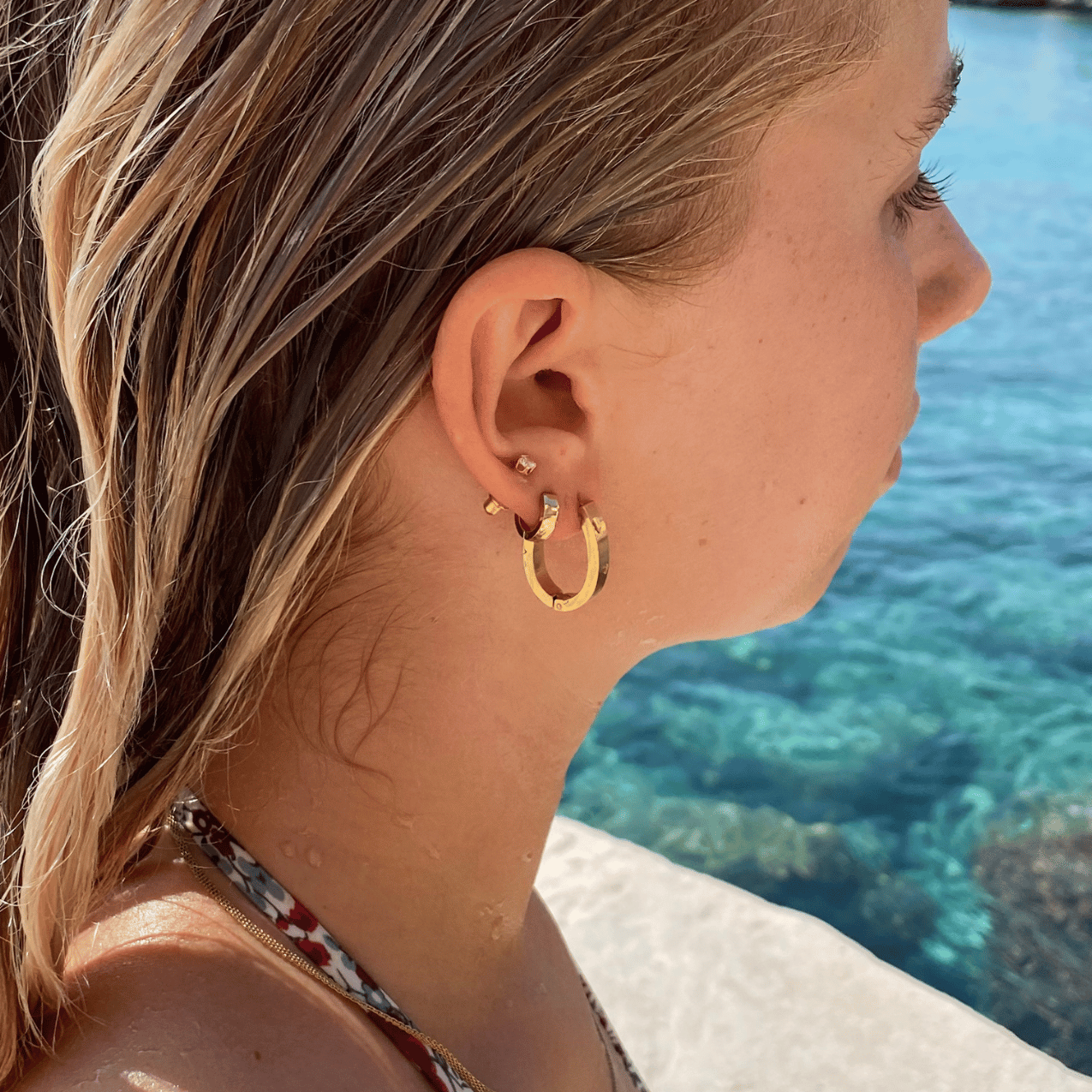 18k guldbelagt kirurgisk stål, nikkelfri og vandfast. Smykket tåler vand, sved, parfume og mister ikke farven