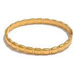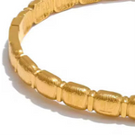 Guldbelagt kirurgisk stål, nikkelfri og vandfast. Smykket tåler vand, sved, parfume og mister ikke farven