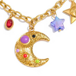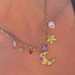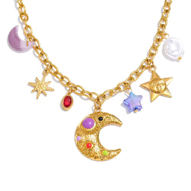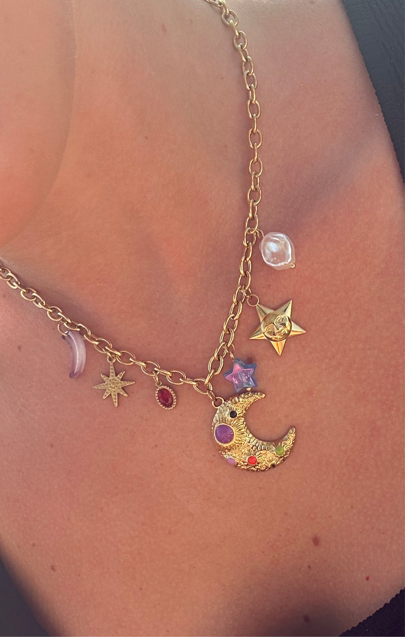 Guldbelagt kirurgisk stål, natursten, samt perler. Kæden er håndlavet.
