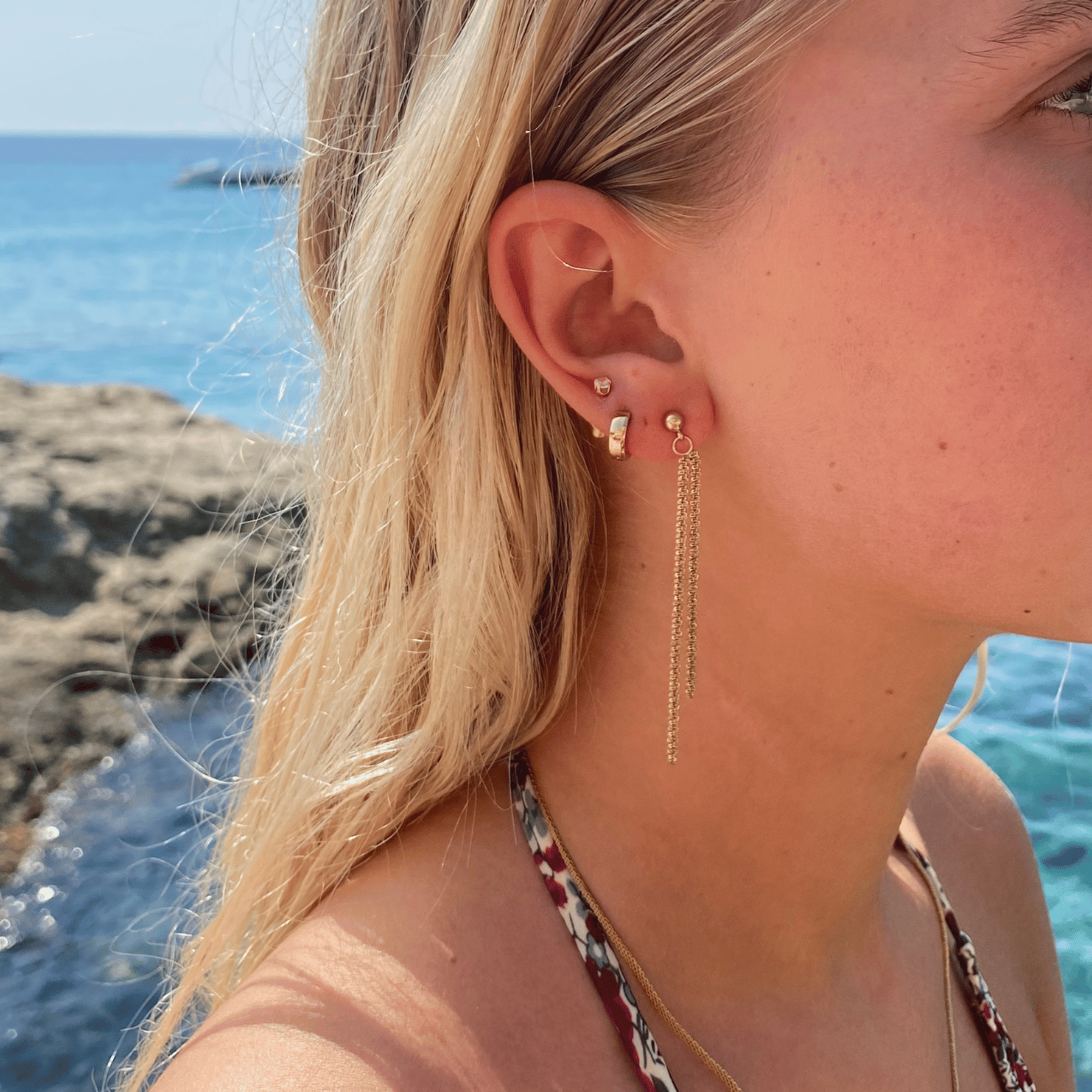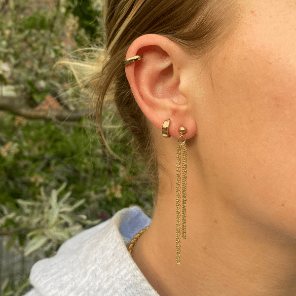 Guldbelagt kirurgisk stål, nikkelfri og vandfaste. Smykket tåler vand, sved, parfume og mister ikke farven