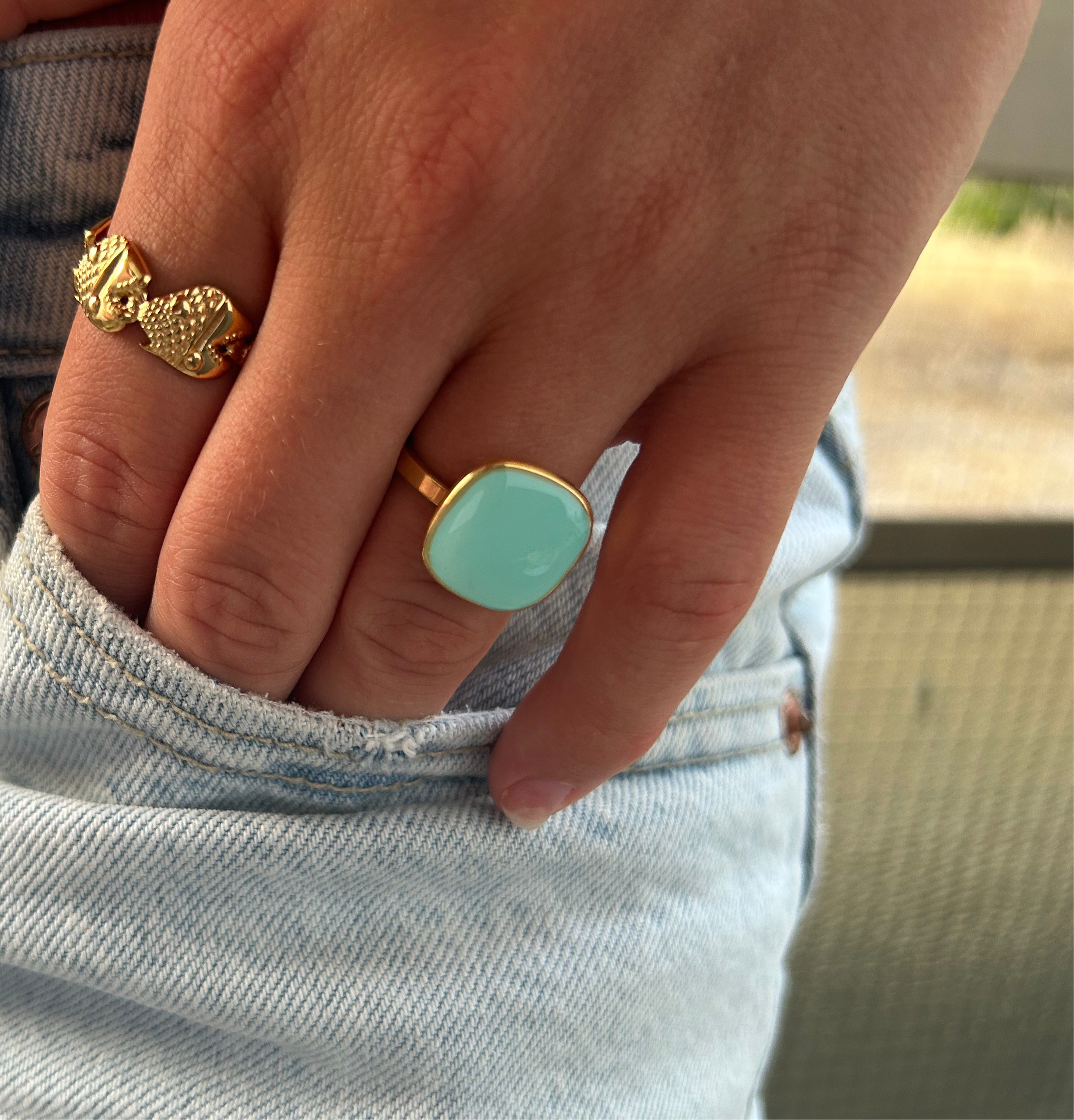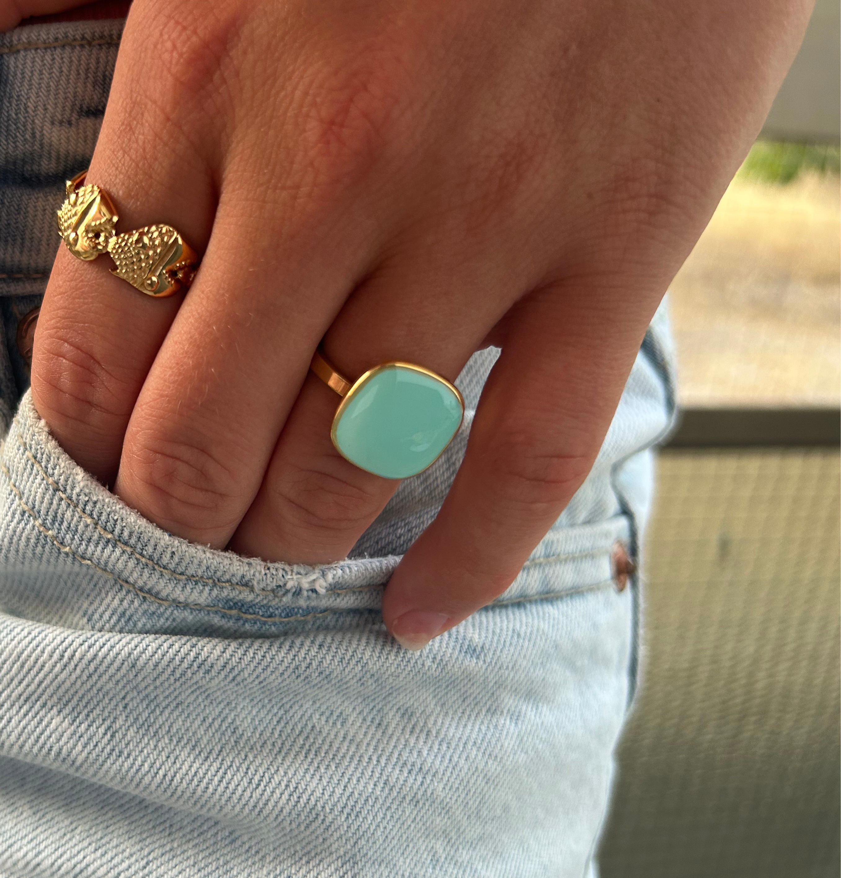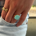Guldbelagt kirurgisk stål, nikkelfri og vandfast. Smykket tåler vand, sved, parfume og mister ikke farven