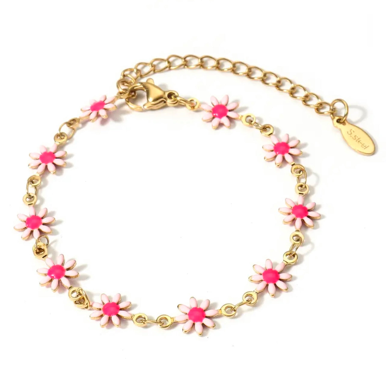Guldbelagt kirurgisk stål, nikkelfri og vandfast. Smykket tåler vand, sved, parfume og mister ikke farven