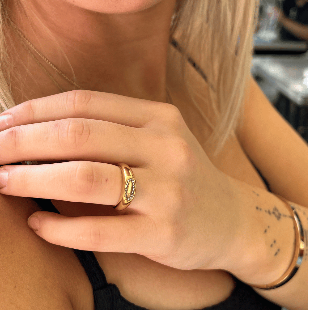 Guldbelagt kirurgisk stål, nikkelfri og vandfast. Smykket tåler vand, sved, parfume og mister ikke farven