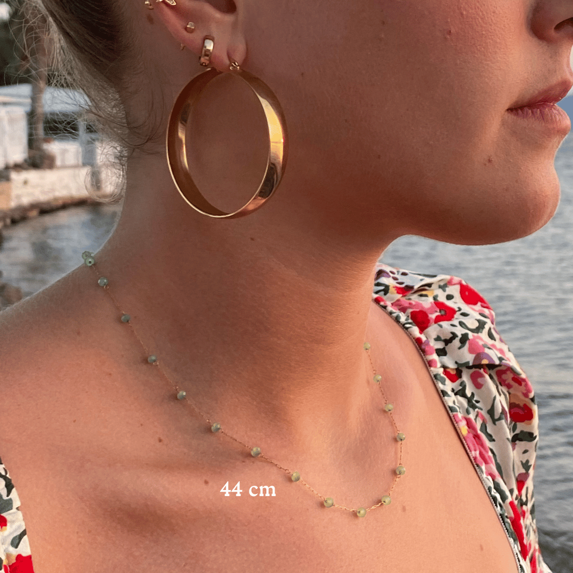 18k guldbelagt kirurgisk stål, nikkelfri og vandfast. Smykket tåler vand, sved, parfume og mister ikke farven.