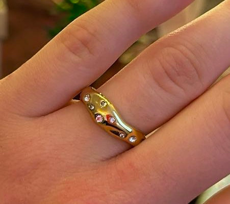 Guldbelagt kirurgisk stål med små zirkonia sten.