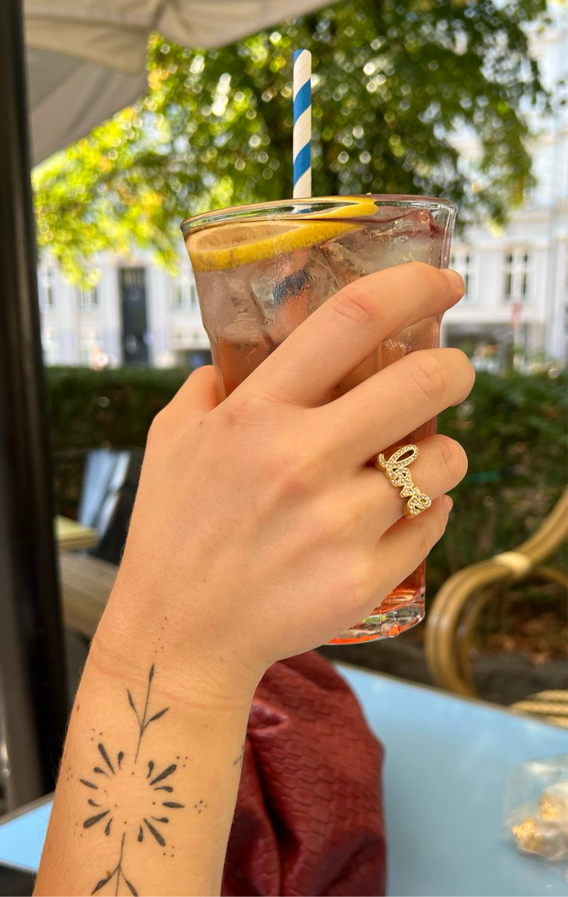 Guldbelagt kirurgisk stål, nikkelfri og vandfast. Smykket tåler vand, sved, parfume og mister ikke farven