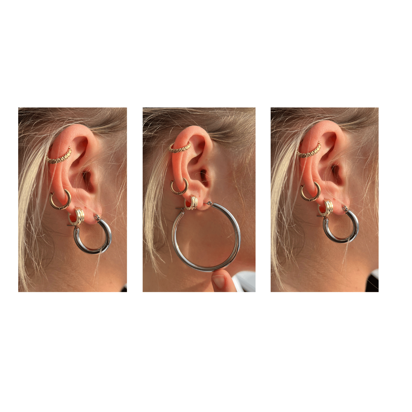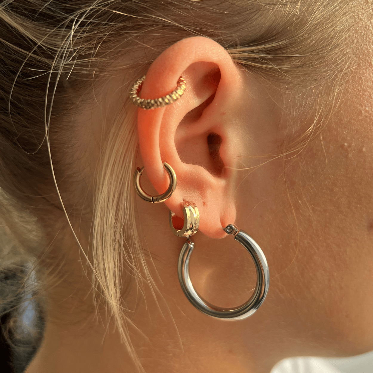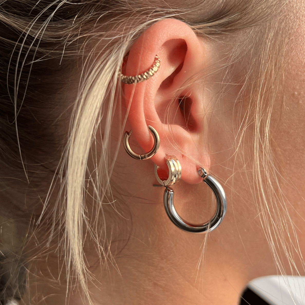 Kirurgisk stål, nikkelfri og vandfast. Smykket tåler vand, sved, parfume og mister ikke farven