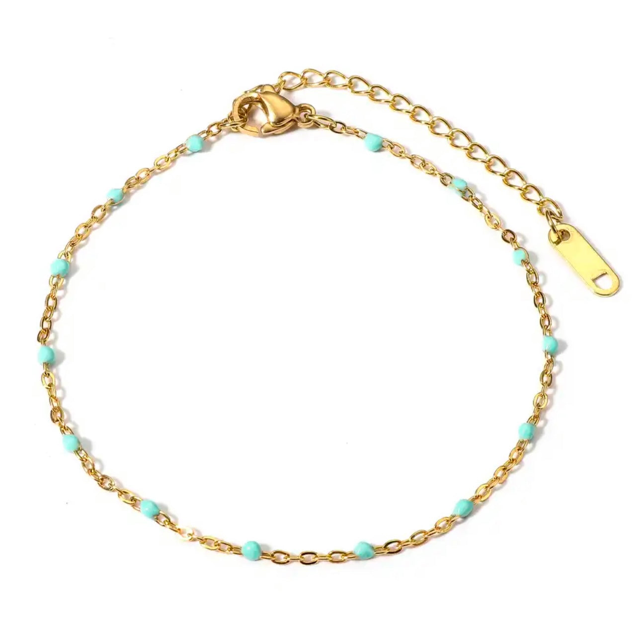 Guldbelagt kirurgisk stål, nikkelfri og vandfast. Smykket tåler vand, sved, parfume og mister ikke farven