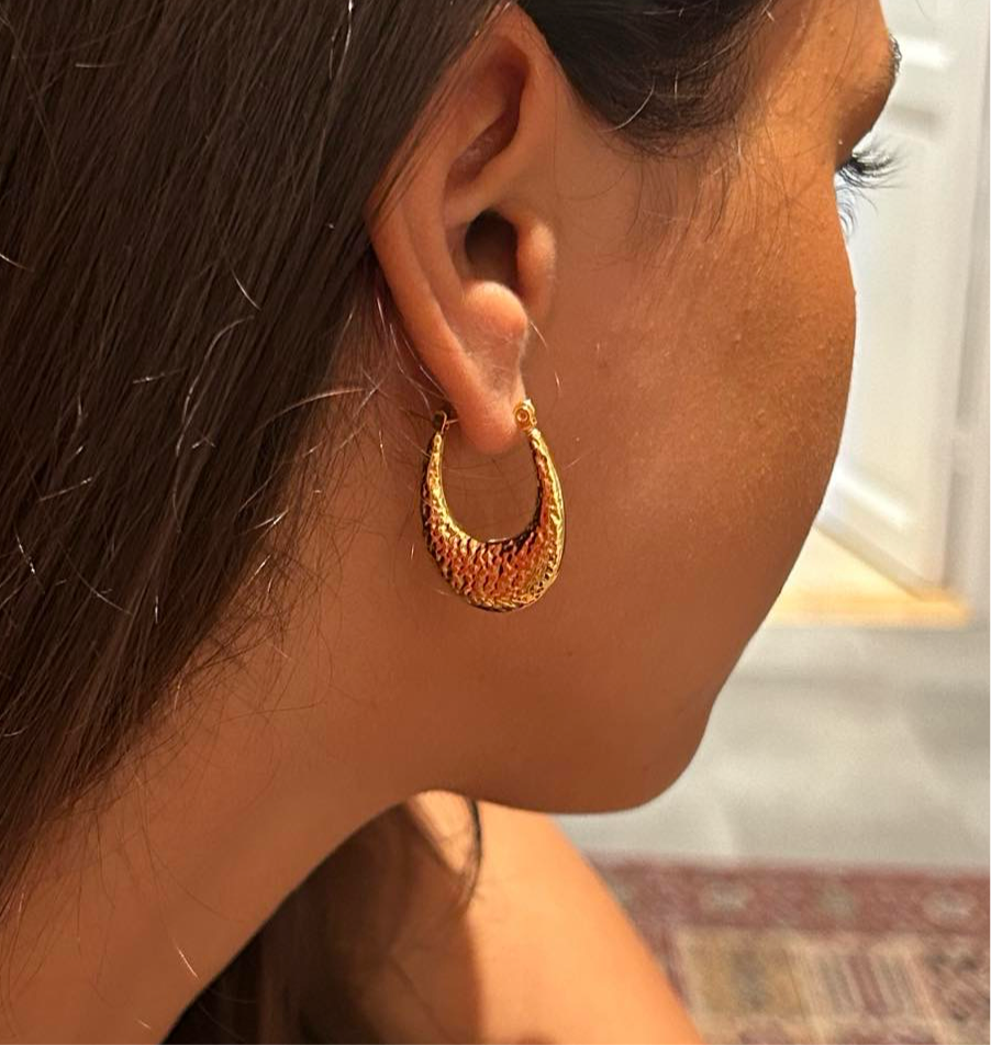 18k guldbelagt kirurgisk stål, nikkelfri og vandfast. Smykket tåler vand, sved, parfume og mister ikke farven